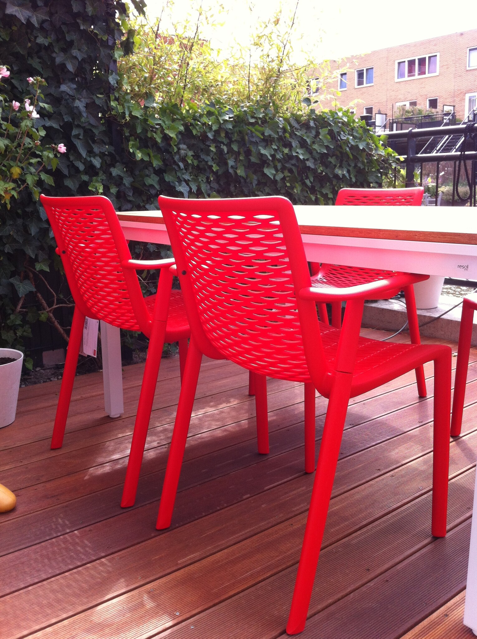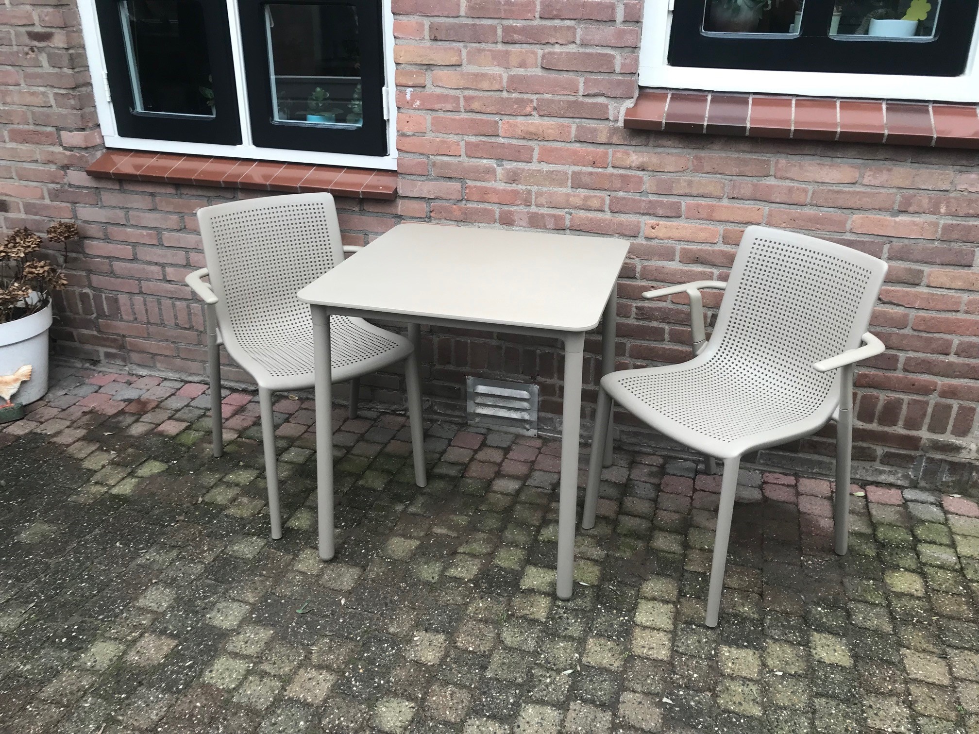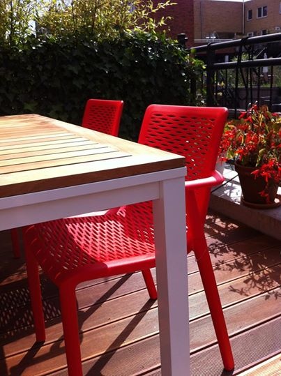 Totaal 37 stuks stoelen, waarvan 19 stuks armstoelen en 18 stuks bistrostoelen. Kleuren wit (21x) -rood (8x) – zand (4x) – chocolade (2x) – olijfgroen(2x).
