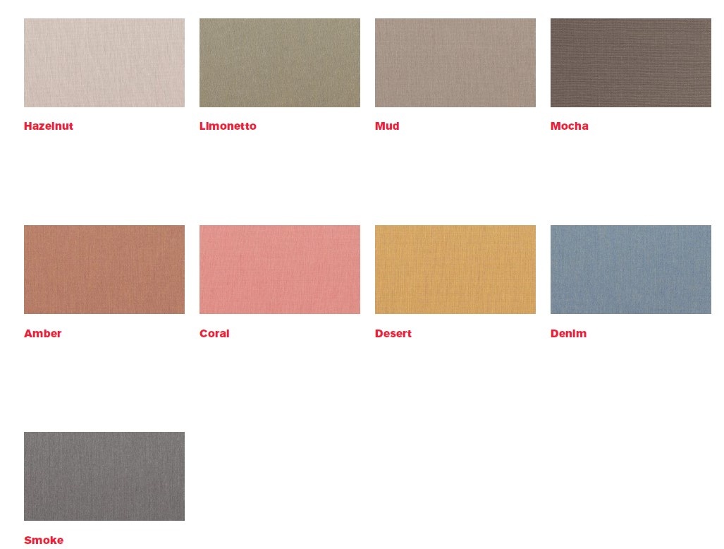 Kleuren Bini kussen: hazelnoot, zand, limonetto, toscaans geel, amber, coral, smoke