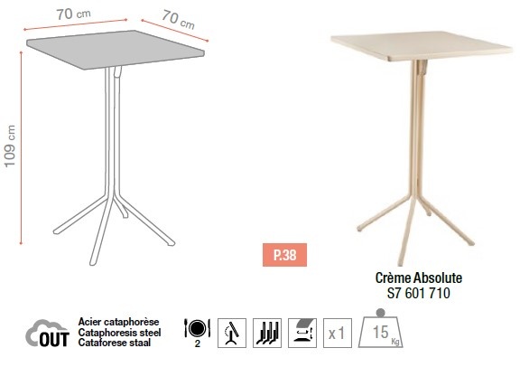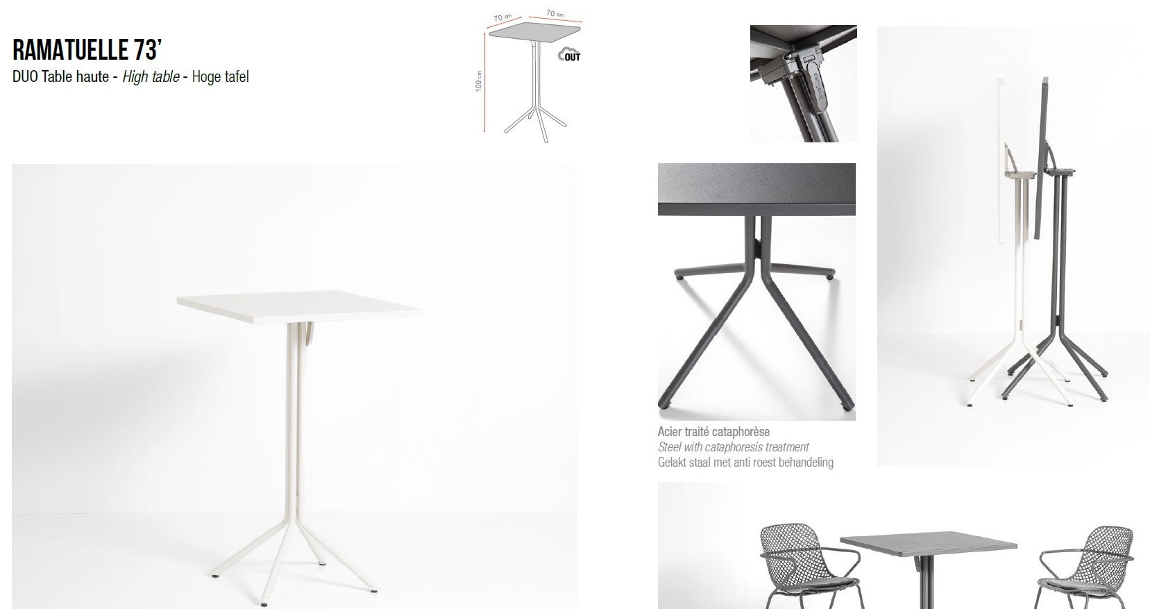De verfijnde hoge bistrotafel Ramatuelle 73' Duo heeft een gelakt stalen onderstel en vierkant opklapbaar topblad. Deze duurzame en stijlvolle terrastafel wordt geproduceerd in Frankrijk door Grosfillex. Het staal is gegarandeerd roestvrij behandeld en gelakt via kataforese. Deze buitentafel heeft een nestbaar topblad van 70x70 cm en is geschikt voor 2 personen. Het gelakte stalen onderstel is superieur behandeld tegen roestvorming en heeft steldoppen. Alle materialen garanderen een lange levensduur. Geschikt voor projectmatig en continue buiten gebruik.