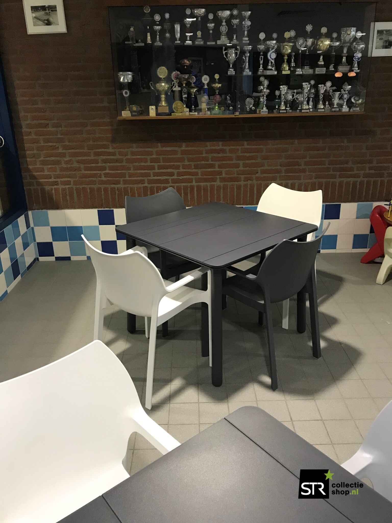 Strakke moderne bistrotafel Noa recycled van het Spaanse merk Resol ontworpen door David Carrasco. De tafel is gemaakt van gerecycled polypropyleen versterkt met glasvezel. Deze kunststof tafel is milieubewust geproduceerd en UV beschermd. Door de dunne sleuven in het matte kunststof blad heeft de tafel een moderne uitstraling. De poten zijn eenvoudig aanschroefbaar en te demonteren. Geschikt voor binnen en buiten gebruik. Gemakkelijke montage zonder gereedschap. Ook geschikt voor projectmatig gebruik. Duurzame en milieubewust geproduceerde bistrotafel.