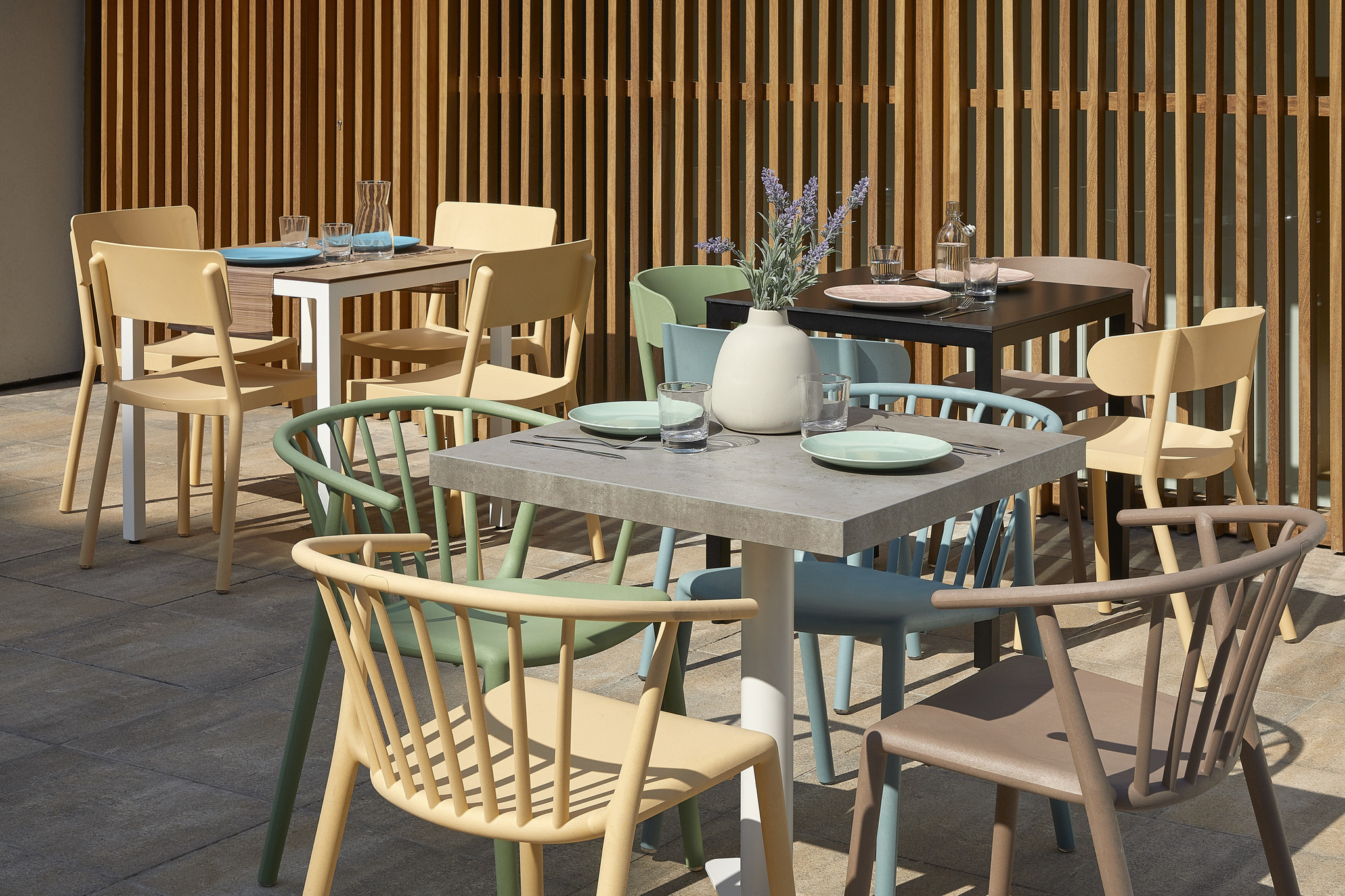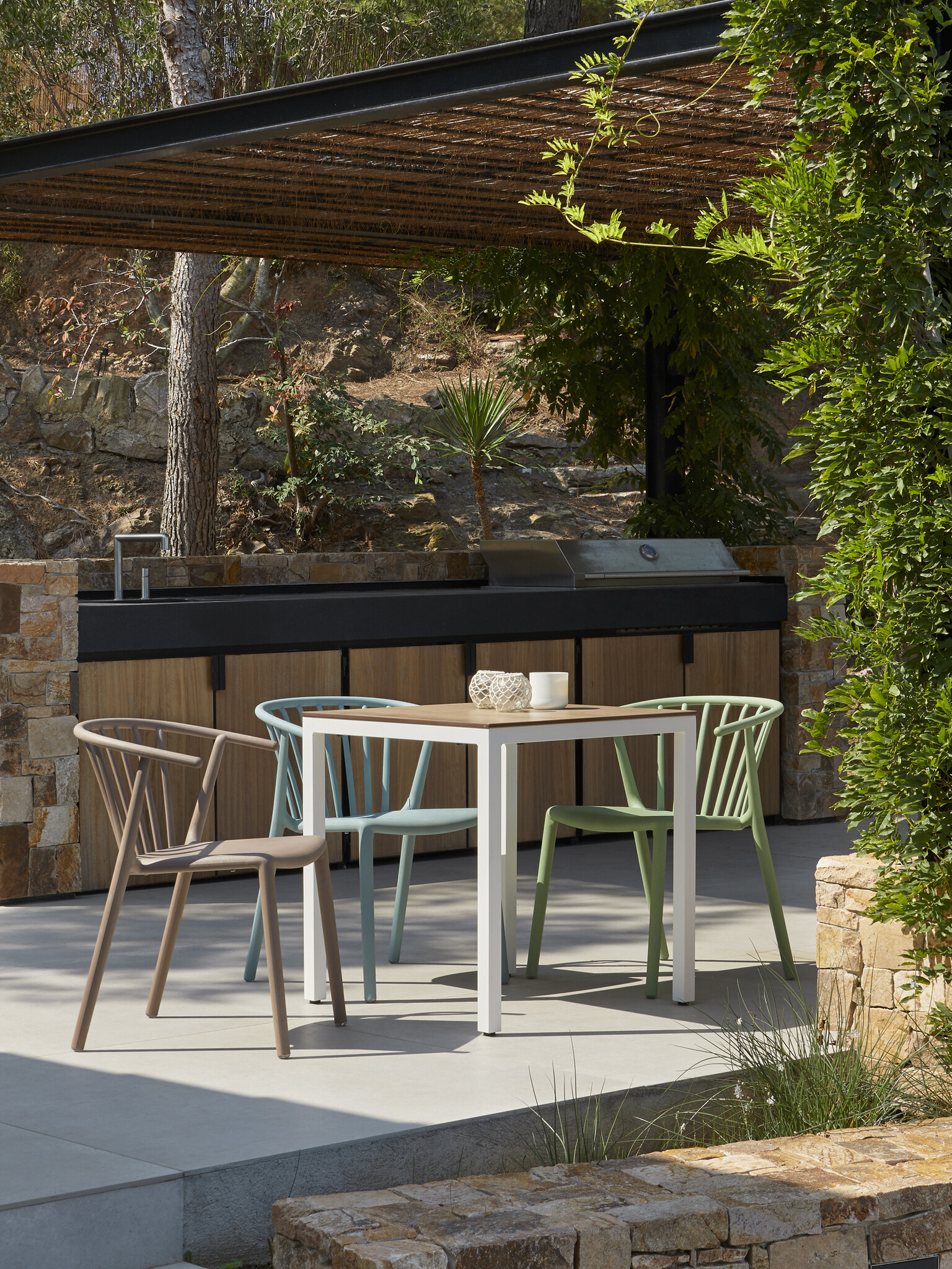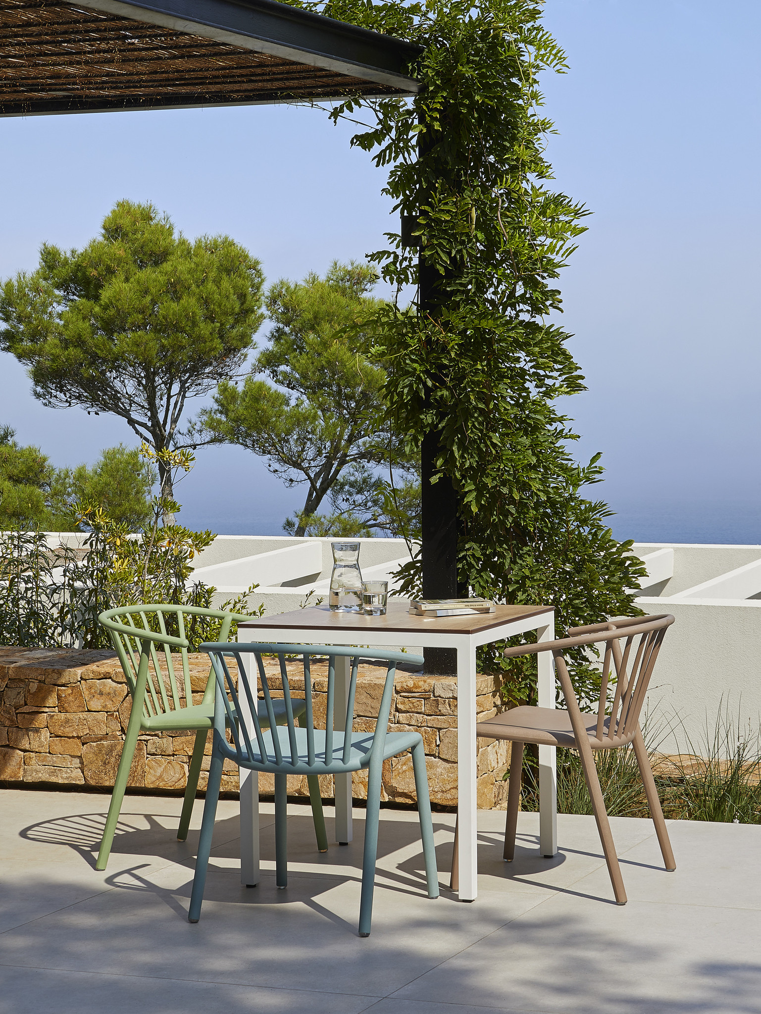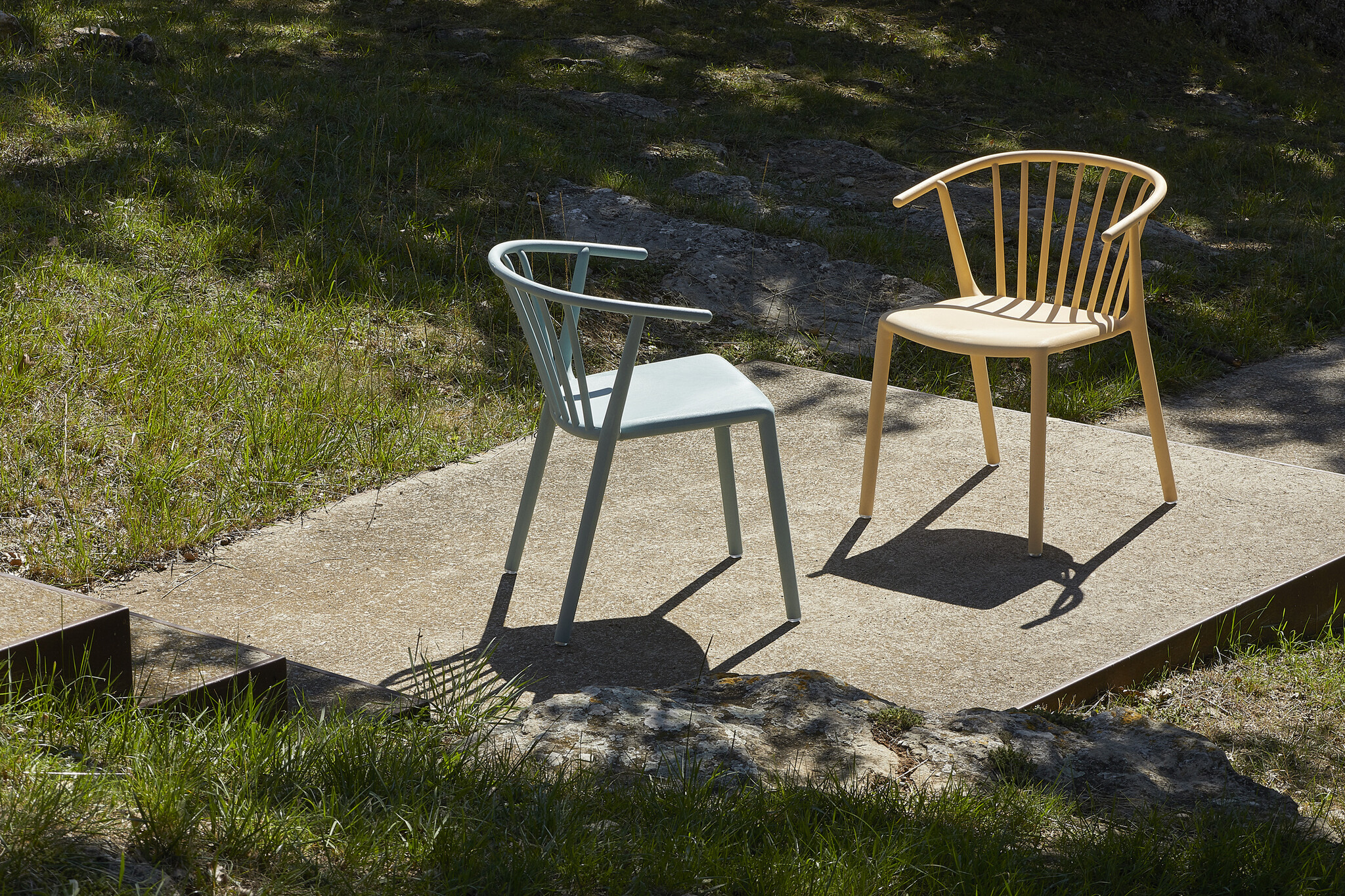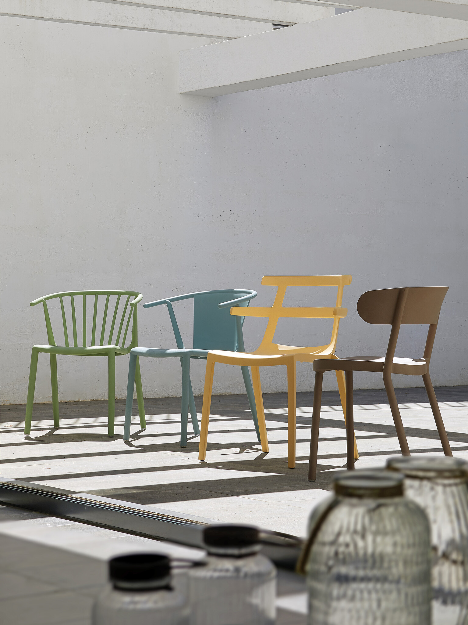 Moderne kunststof armstoel Woody recycled van het Spaanse Resol. De Woody recycled armstoel is ontworpen door Josep Llusca en heeft een vintage en een 'groen' karakter. De Woody armstoel is gemaakt van gerecycled polypropyleen versterkt met glasvezel. De kunststof armstoel is mat uitgevoerd, licht in gewicht en onderhoudsvriendelijk. Deze stapelbare stoel is zeer geschikt voor project gebruik en continue buitengebruik. De kunststof stoel is volledig recyclebaar, UV-beschermd en zeer duurzaam. De Woody recycled armstoel bestaat uit verschillende soorten gerecycled kunststof waardoor in detail de kleur meer variëteit heeft en wat 'valer' toont.