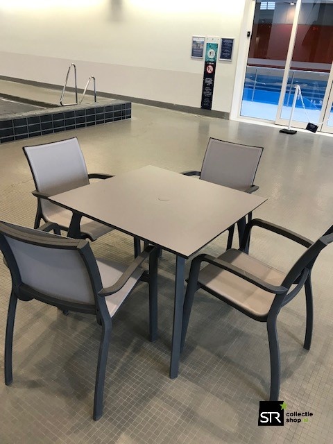 Elegante en robuuste armstoel Sunset van het Franse Grosfillex. Een stapelbare terrasstoel voor langdurig en zeer duurzaam gebruik. Deze projectstoel is opgebouwd uit verschillende hoogwaardige materialen waaronder een milieuvriendelijk textileen. Op een vervangbaar aluminium frame is antibacterieel Bio-textileen gespannen wat geplaatst is op een mat kunststof onderstel. Het kunststof frame is gemaakt van gerecycled kunststof en is verrijkt met glasvezels en aluminiumdeeltjes die textuur, glans en stevigheid geven. Het Ecolibrium Bio textileen draagt bij aan het milieu en tot een optimaal en comfortabel zitcomfort. Het textileen heeft een plantaardige weekmaker zonder Pfas en lood dus erg milieuvriendelijk.