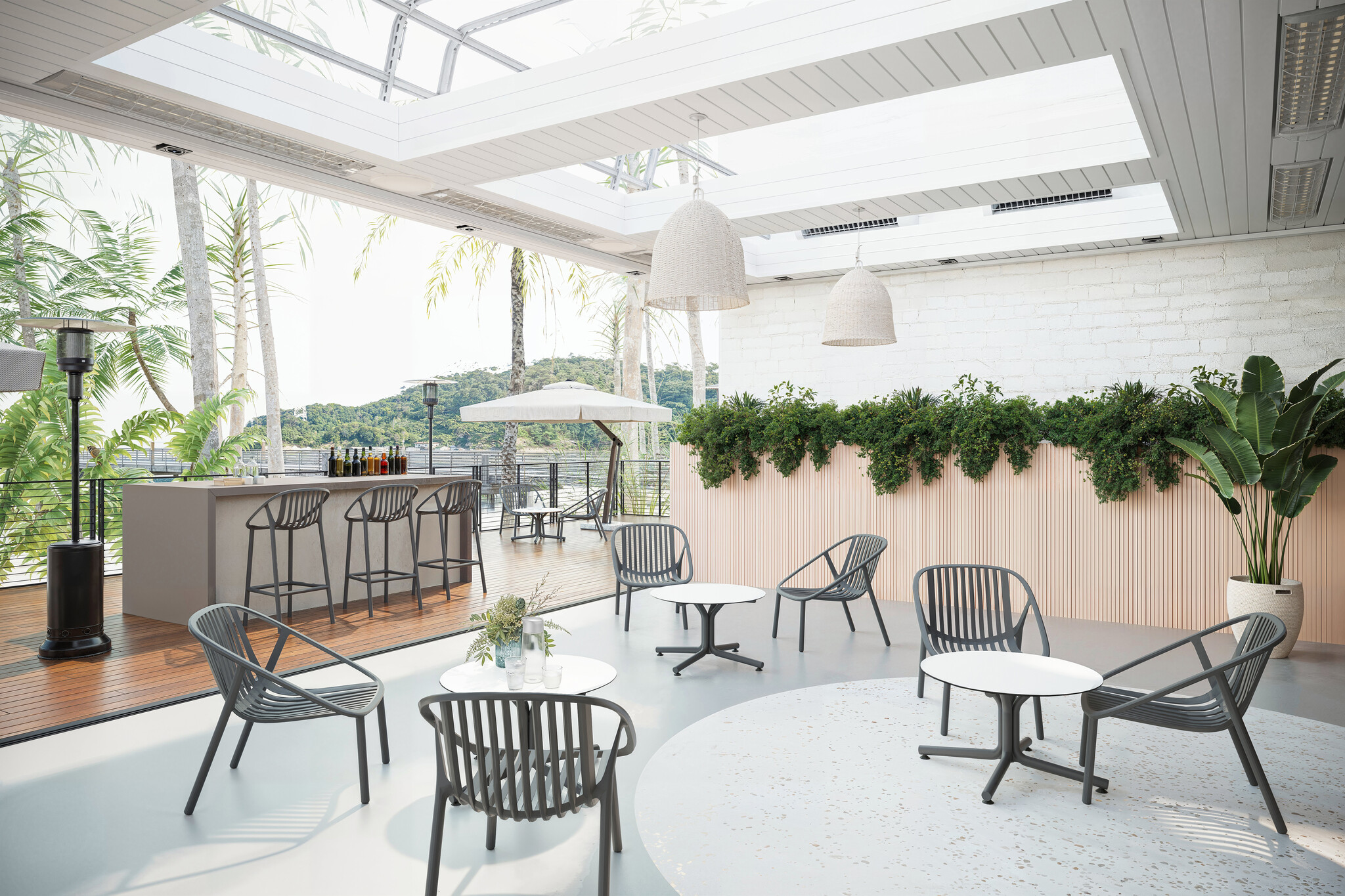 De design lounge stoel Bini is een modern ontwerp van Joan Gaspar voor het Spaanse merk Resol. De moderne kunststof lage armstoel bestaat uit onderhoudsvriendelijk polypropyleen versterkt met glasvezel. Het gematteerde lichtgewicht kunststof is UV-beschermd, recyclebaar en weersbestendig. De lounge stoelen zijn projectmatig getest en zeer duurzaam. Ideaal voor een moderne en transparante uitstraling in zwembaden of publieke ruimtes.