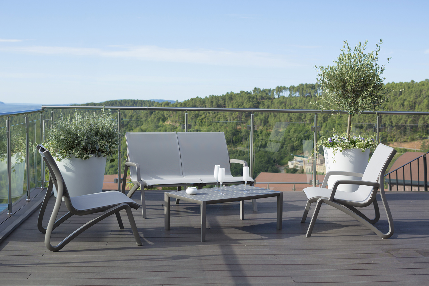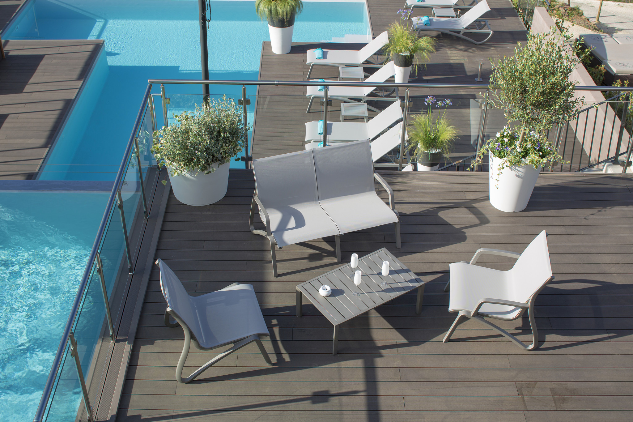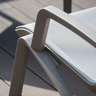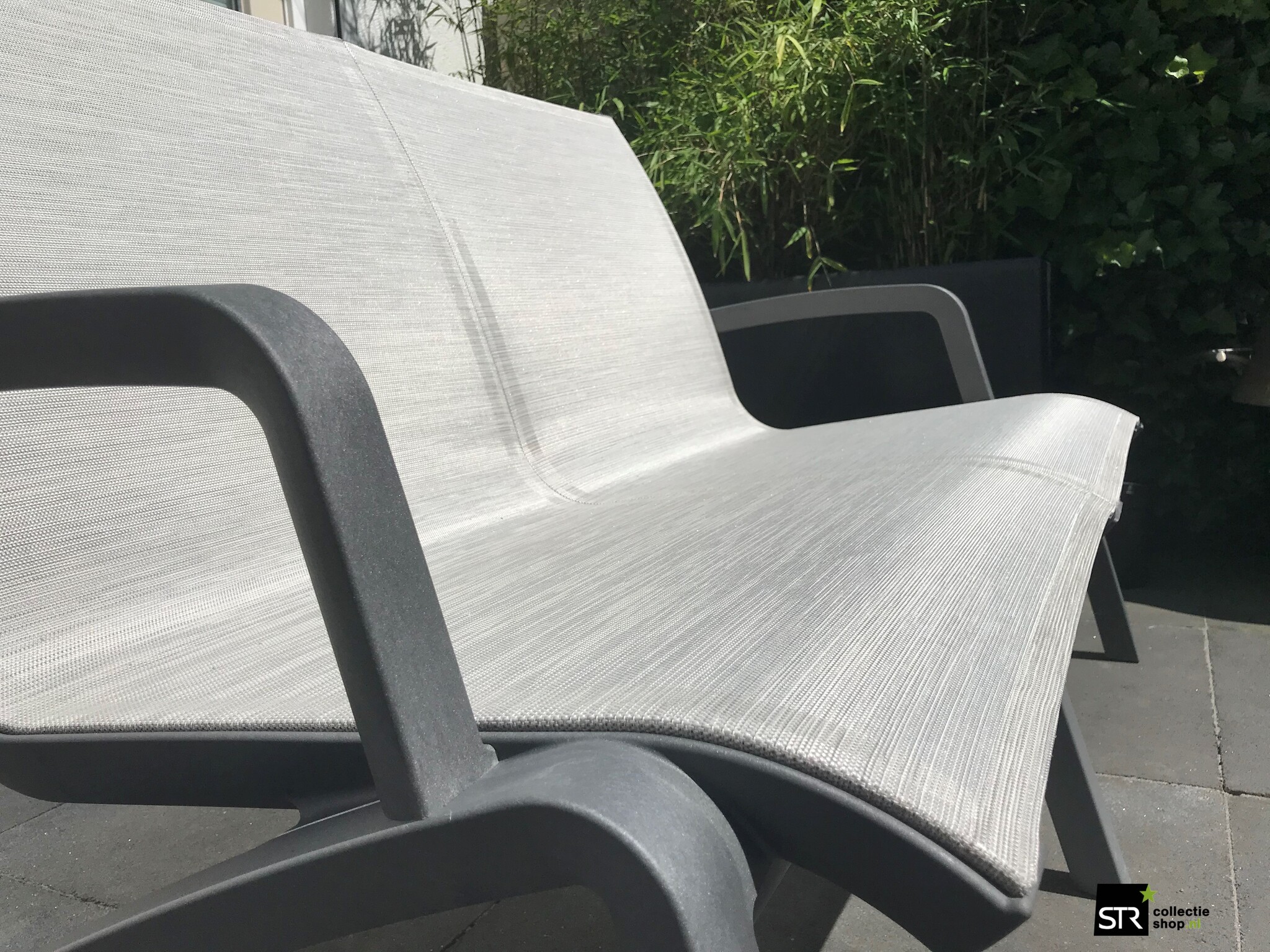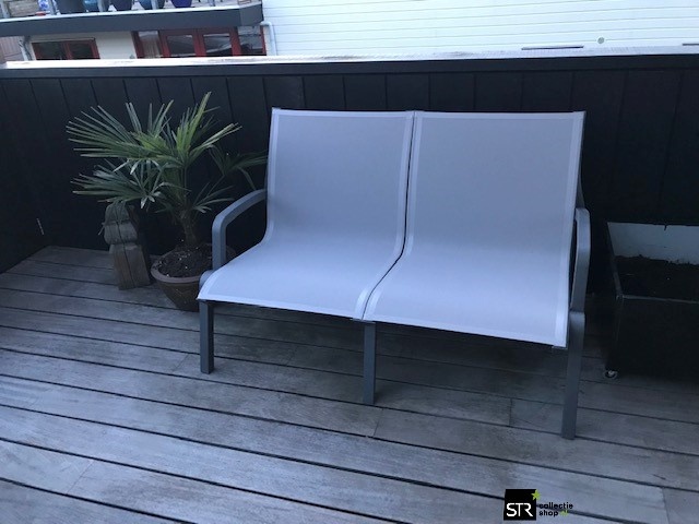 De Sunset loungebank heeft de uitstraling van aluminium en het gemak van kunststof. Het extra brede en diepe textileen en het ontbreken van hoofd- en beenranden zorgt voor een uitstekend zitcomfort. De armsteunen zijn robuust en sluiten perfect aan, deze worden via zelfmontage erop geschroefd. Zonder armsteunen is de ruime Sunset 2-zitter stapelbaar. De Sunset collectie is projectmatig getest en Greenguard gecertificeerd. De Sunset 2-zitsbank wordt gemaakt voor de meest intensieve gebruiksomstandigheden en is daardoor ideaal voor wellness en zwembaden.