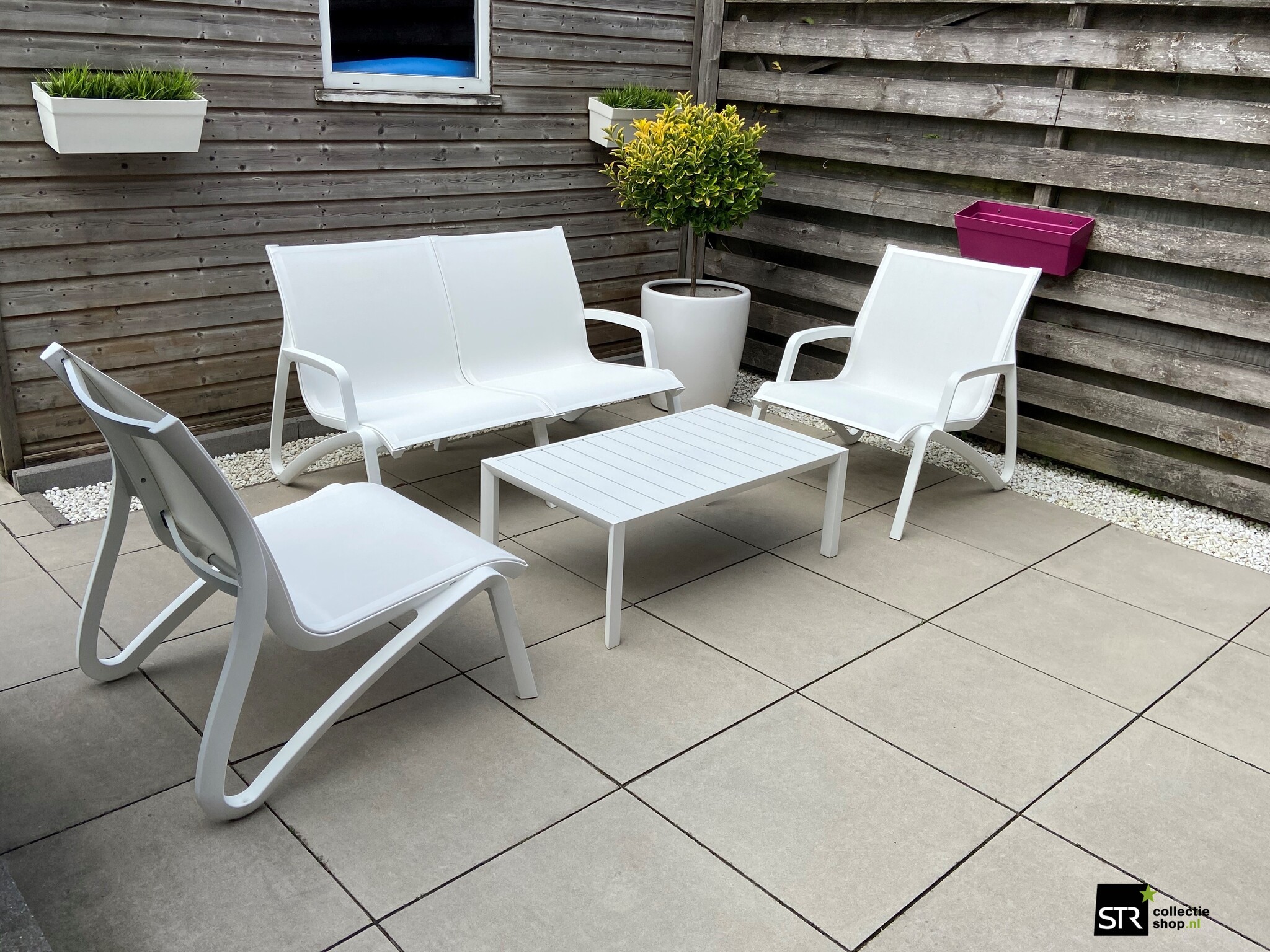 In het sterke composiet frame worden aluminium deeltjes en glasvezel verwerkt en daarmee krijgt het een gematteerde metaal-look. Het frame van de loungebank bestaat uit 50% gerecycled kunststof en is bestand tegen extreme temperaturen en geheel recyclebaar. Het sterke duurzame Ecolibrium textileen met PVC-coating heeft een Microban behandeling ondergaan en is daardoor antibacterieel, antischimmel en UV-beschermd. Dit onderhoudsvriendelijke outdoor textileen bestaat uit plantaardige materialen zonder toevoegingen van Pfas of lood. Het milieuvriendelijke textileen is toch zeer sterk en elastisch en zal niet uitrekken. Het doek van de Sunset lounge banken is eenvoudig uitneembaar en te vervangen.