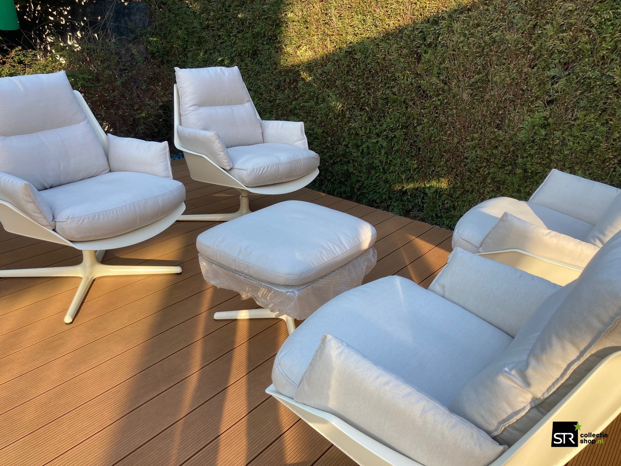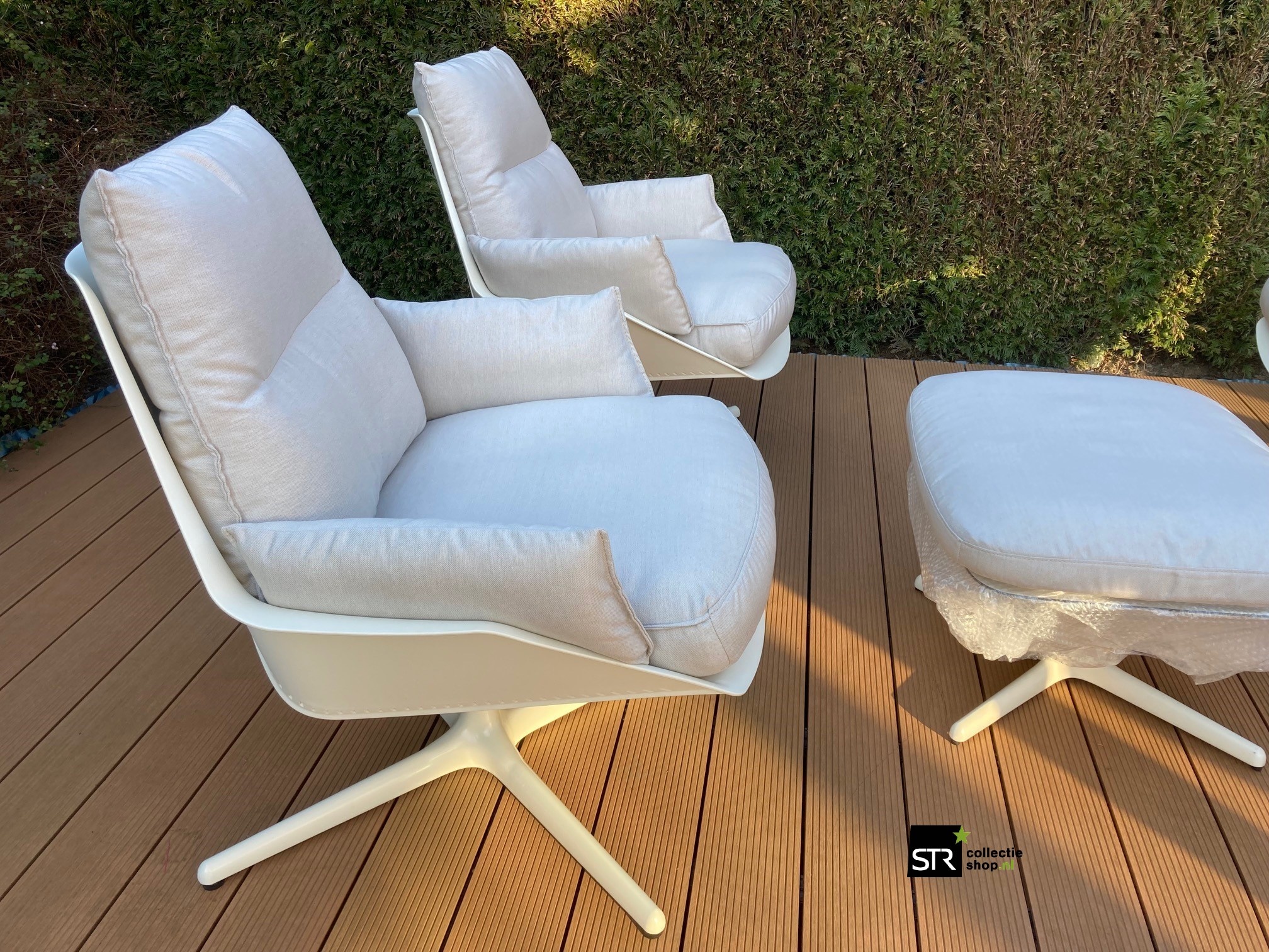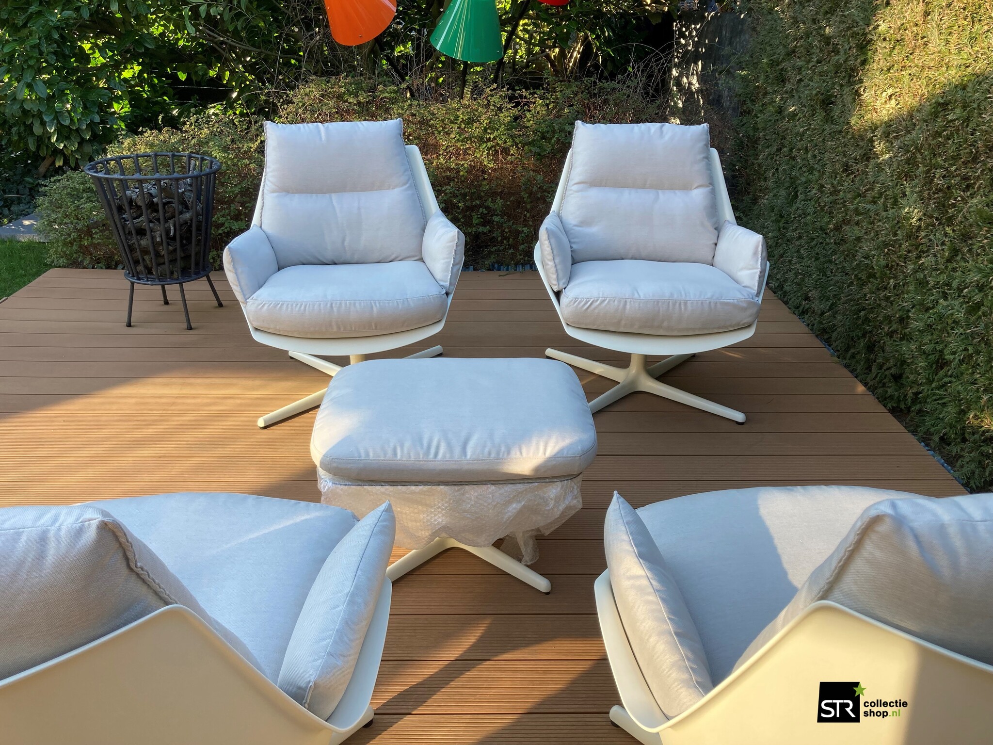 Een bijpassende poef met gerecycled foamkussen of HPL bijzettafel zijn toe te voegen aan dit loungemeubel.
