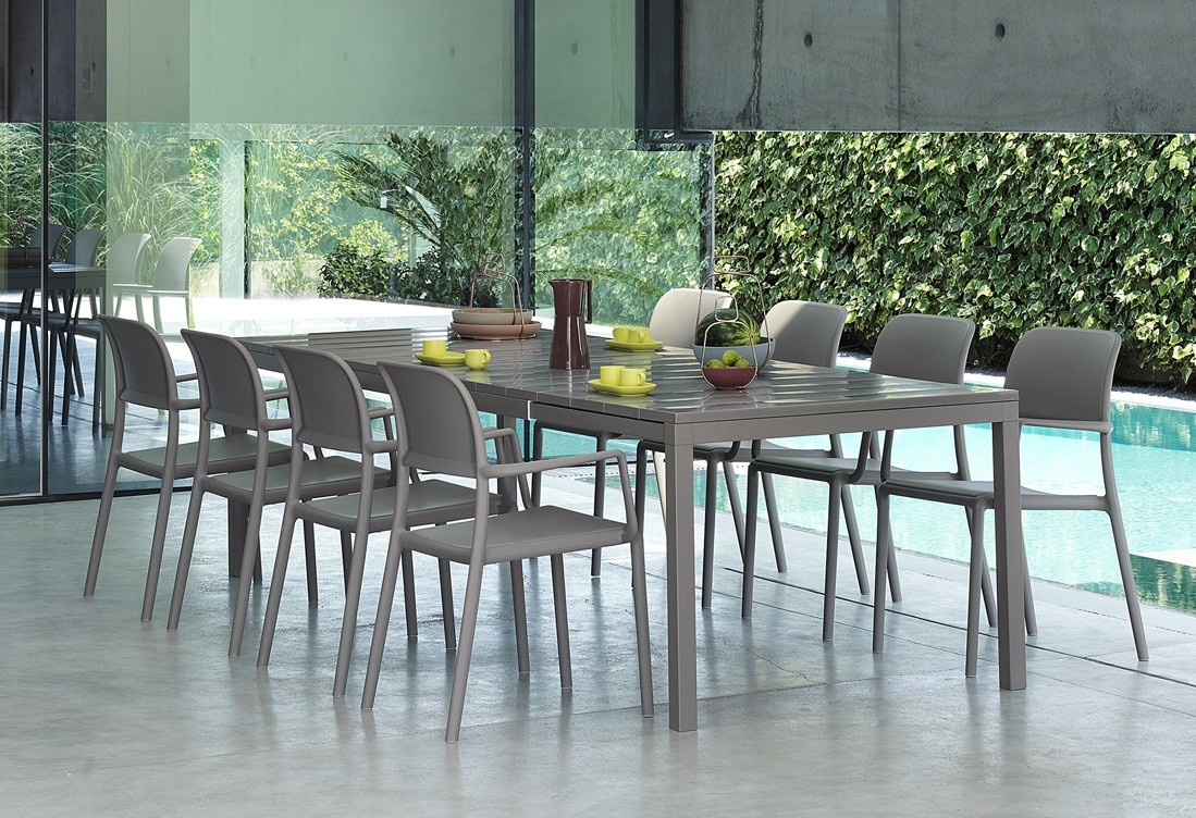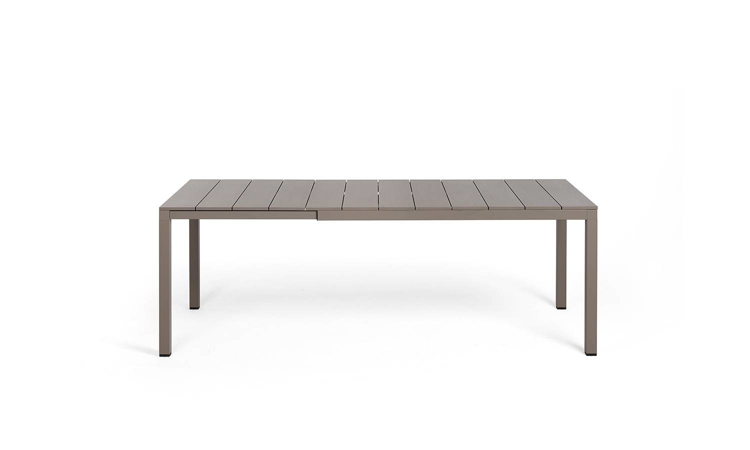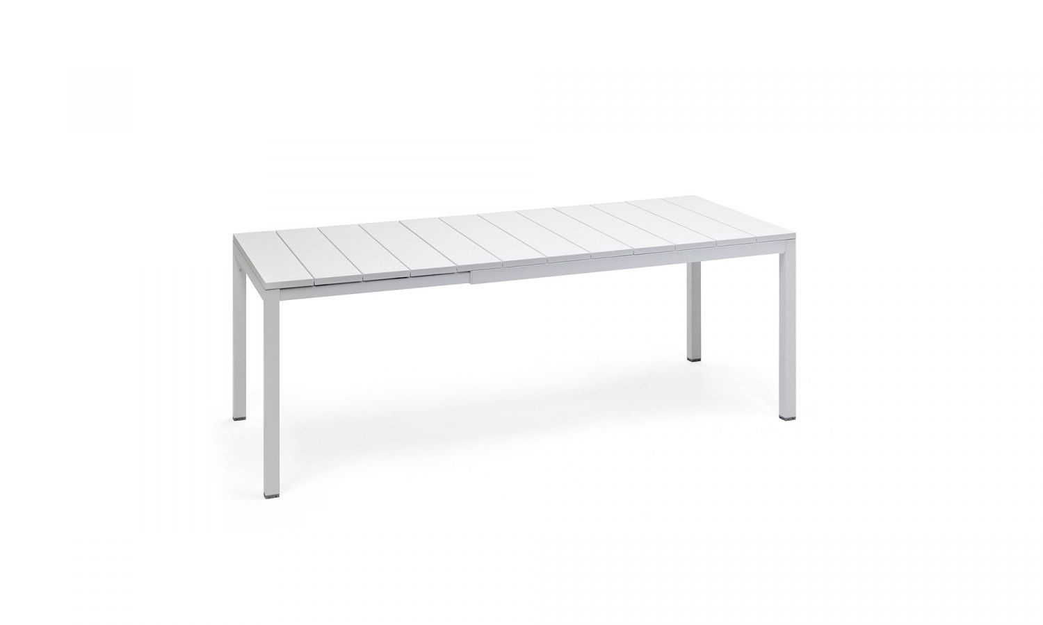 Het Italiaanse Nardi heeft een sterke uitschuifbare terrastafel Rio ontworpen. Deze weersbestendige tafel kan worden uitgeschoven van 140cm tot een lengte van 210cm. Het aluminium onderstel is in een matte kleur gespoten en heeft robuuste poten met steldoppen. Het blad bestaat uit brede planken welke in delen geplaatst liggen op een stevig aluminium frame. De bladen worden op het onderstel geplaatst en eenvoudig vastgeklikt. Wanneer de terrastafel niet volledig is uitschoven kan er één blad praktisch onder de tafel worden 'opgeborgen'.