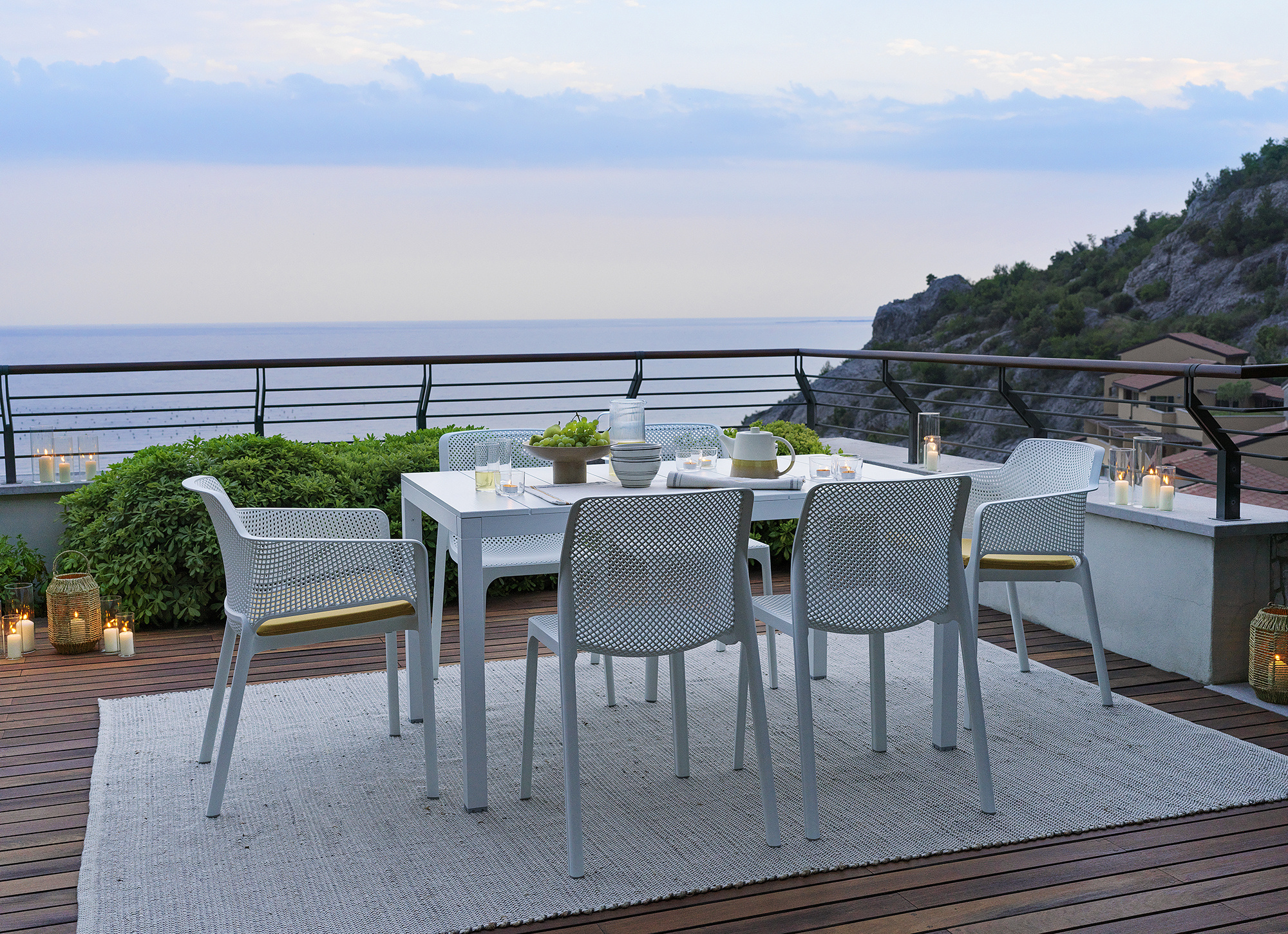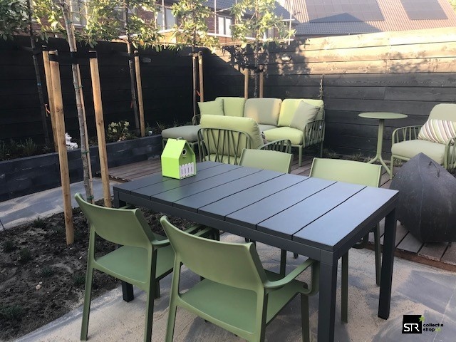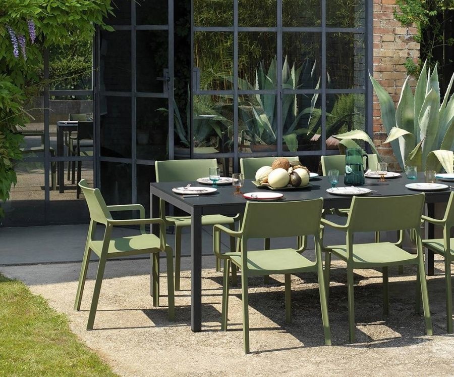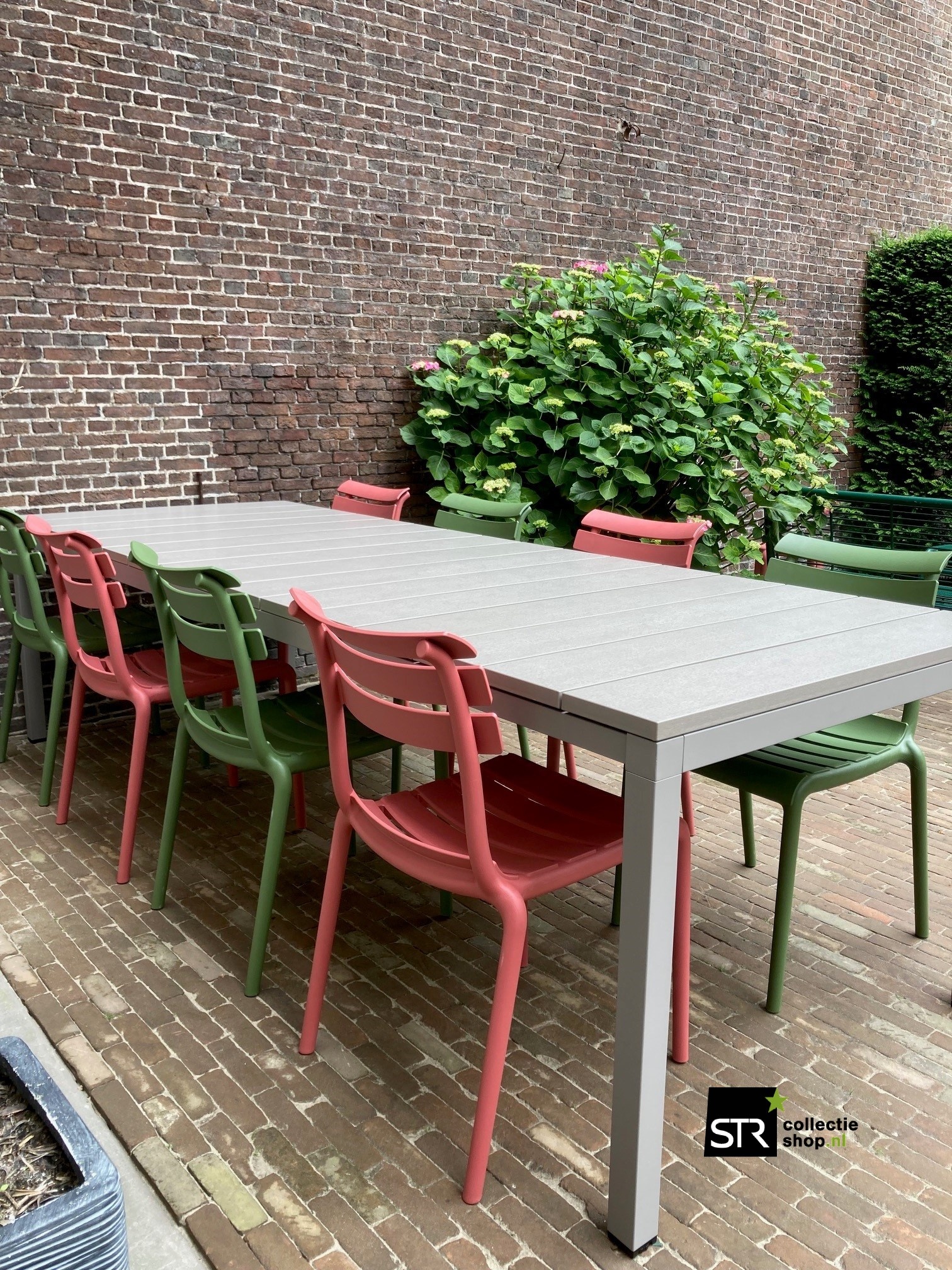 Het Italiaanse Nardi heeft een sterke uitschuifbare terrastafel Rio ontworpen. Deze weersbestendige tafel kan worden uitgeschoven van 140cm tot een lengte van 210cm. Het aluminium onderstel is in een matte kleur gespoten en heeft robuuste poten met steldoppen. Het blad bestaat uit brede planken welke in delen geplaatst liggen op een stevig aluminium frame. De bladen worden op het onderstel geplaatst en eenvoudig vastgeklikt. Wanneer de terrastafel niet volledig is uitschoven kan er één blad praktisch onder de tafel worden 'opgeborgen'.