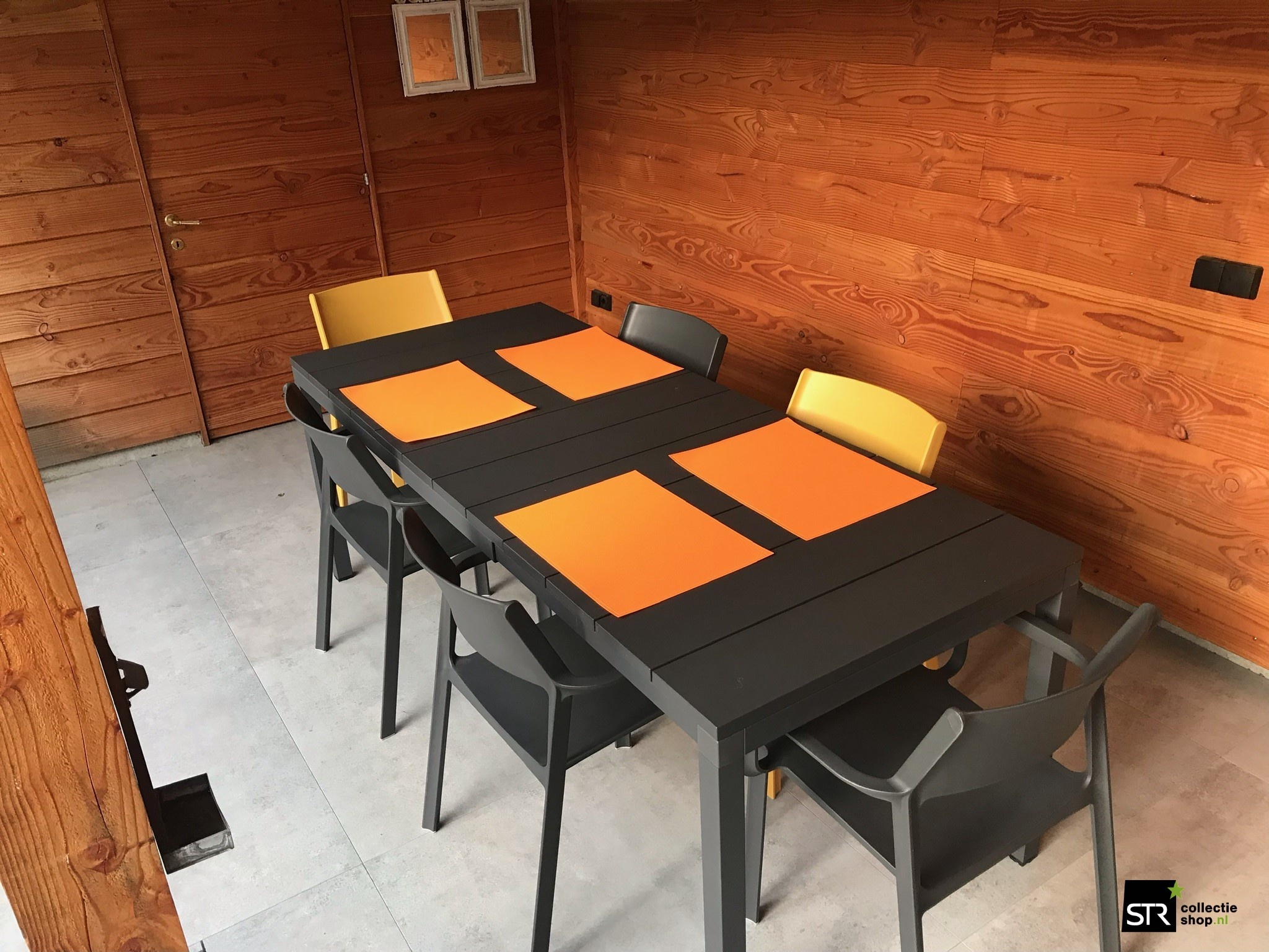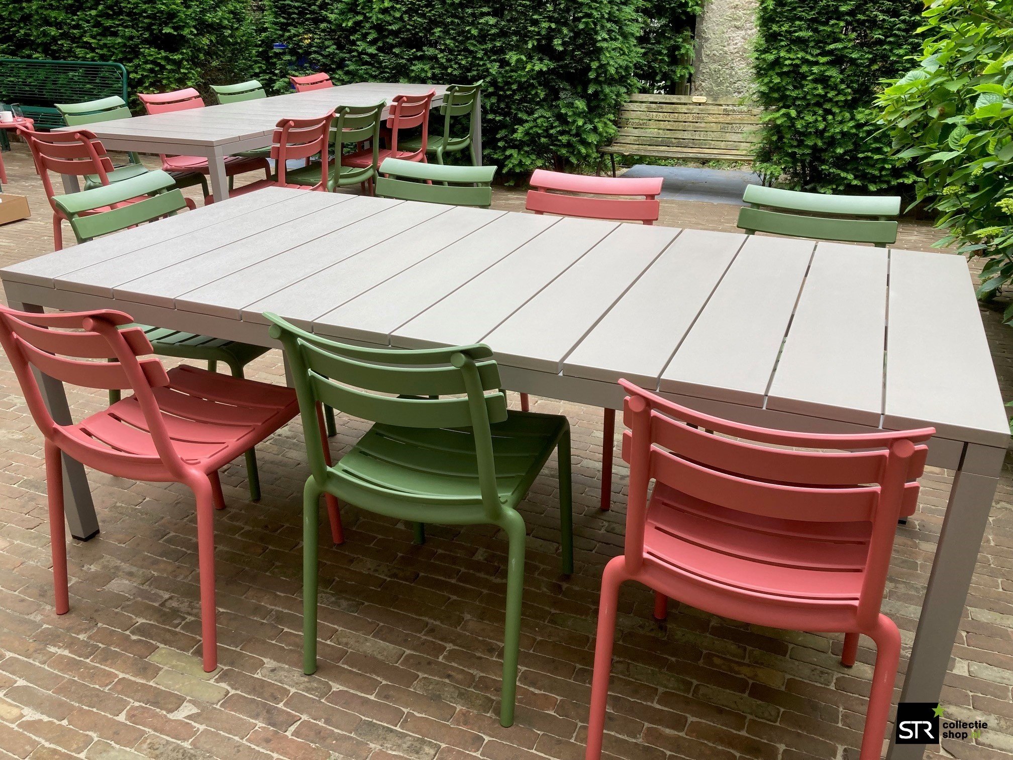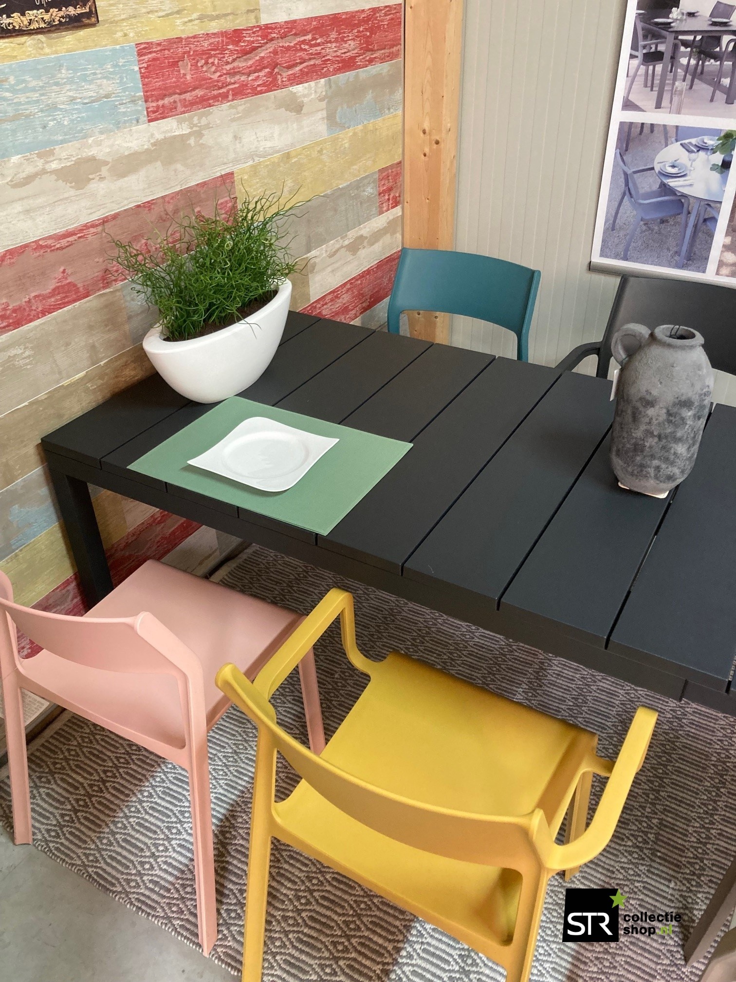 Het Italiaanse Nardi heeft een sterke uitschuifbare terrastafel Rio ontworpen. Deze weersbestendige tafel kan worden uitgeschoven van 210cm tot een lengte van 280cm. Het aluminium onderstel is in een matte kleur gespoten en heeft robuuste poten met steldoppen. Het blad bestaat uit brede planken welke in delen geplaatst liggen op een stevig aluminium frame. De bladen worden op het onderstel geplaatst en eenvoudig vastgeklikt. Wanneer de terrastafel niet volledig is uitschoven kan er één blad praktisch onder de tafel worden 'opgeborgen'.