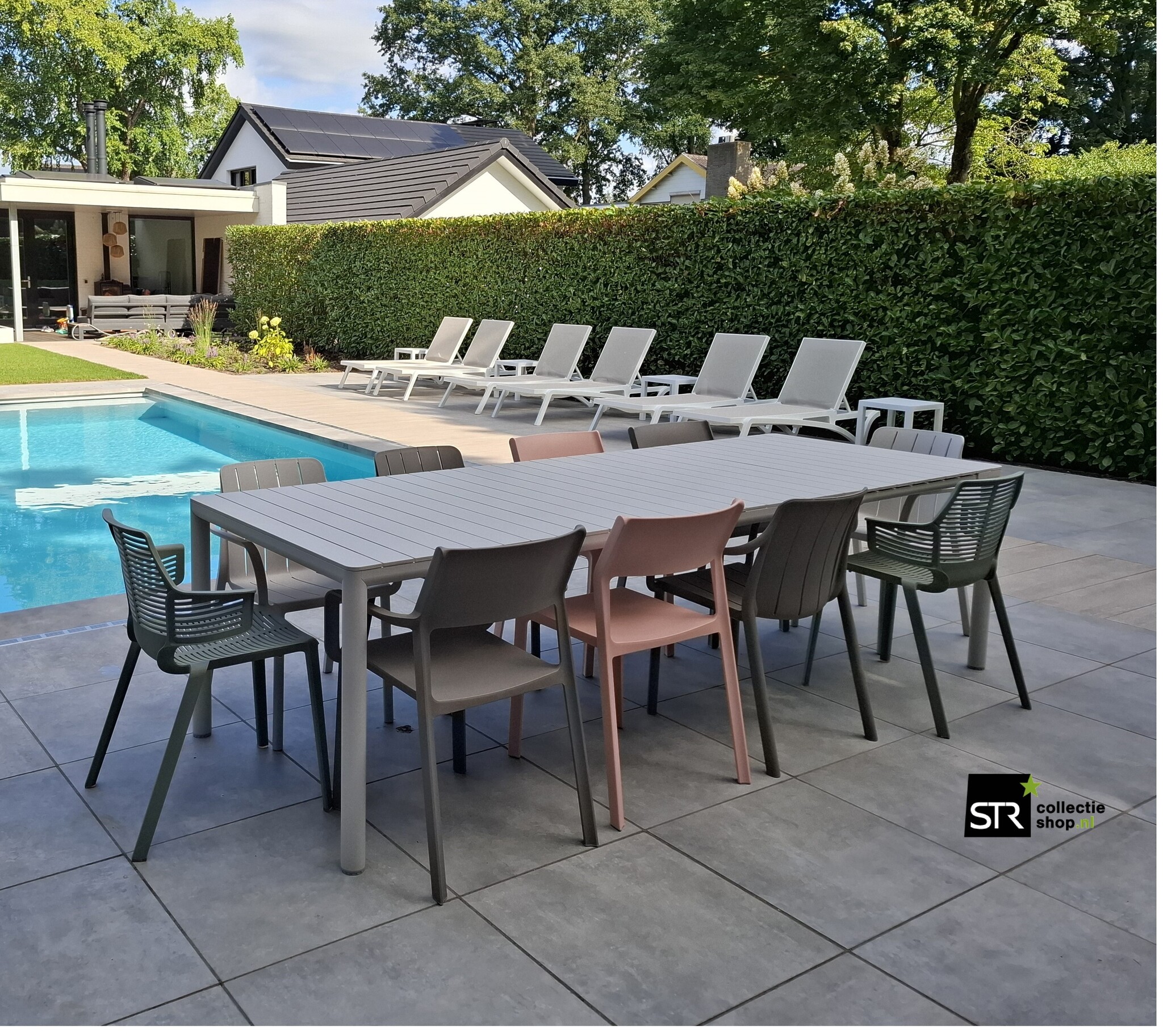 Het Italiaanse Nardi heeft een prachtige uitschuifbare terrastafel Tevere 147 ontworpen. Het design is gericht op zachte lijnen en afgeronde hoeken. Deze weersbestendige tafel kan worden uitgeschoven van 147cm tot een lengte van 211cm. Het aluminium onderstel is in een matte kleur gespoten en heeft robuuste ronde poten met steldoppen. Het blad bestaat uit gekoppelde latten welke in delen geplaatst liggen op een stevig aluminium frame. Wanneer de terrastafel niet volledig is uitschoven kan er één blad praktisch onder de tafel worden 'opgeborgen'.